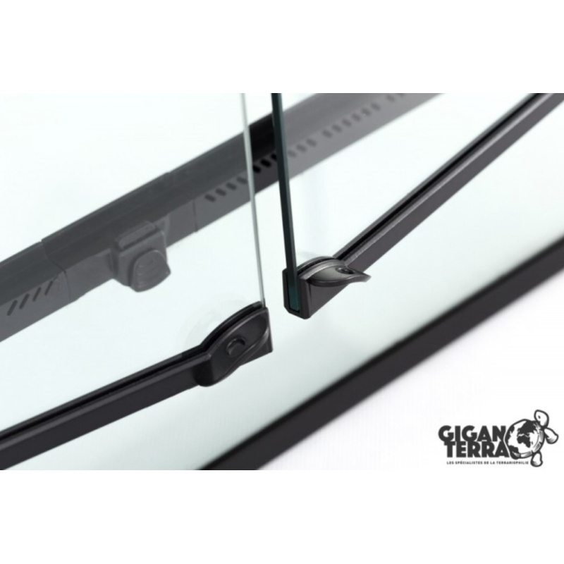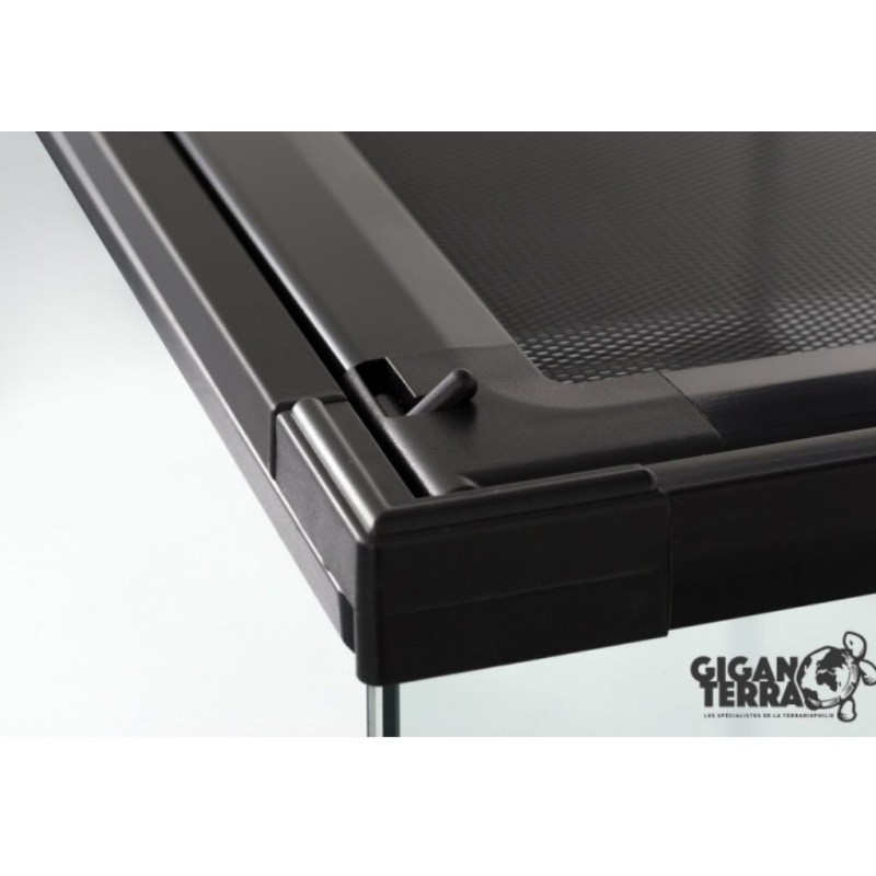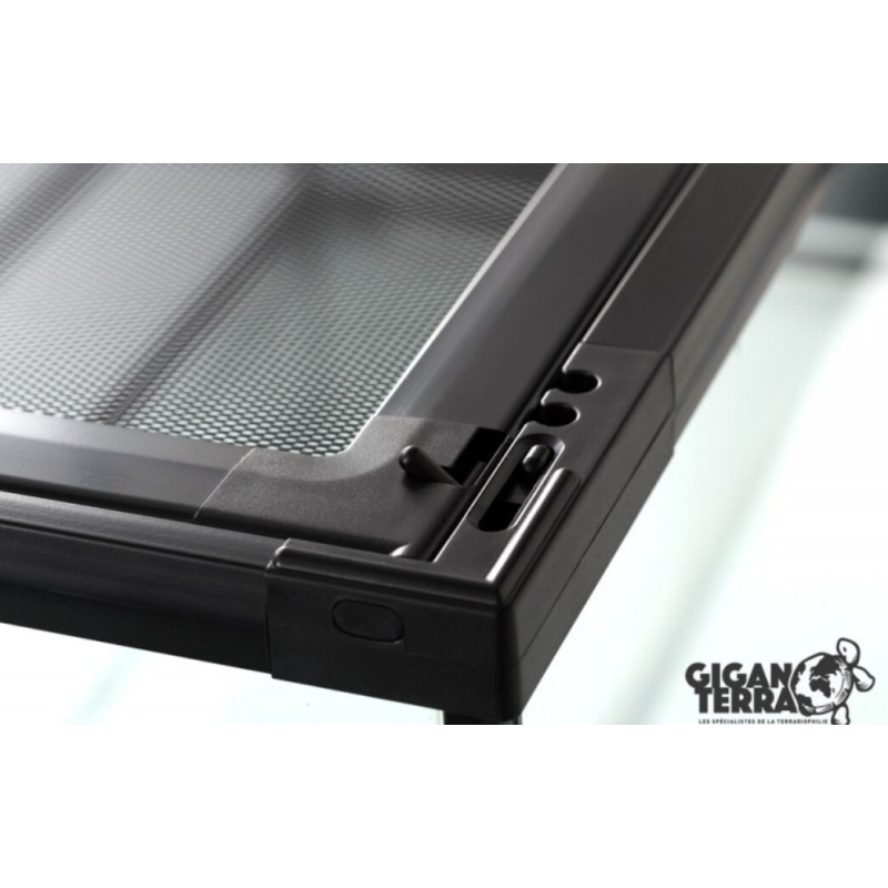 Ilmankierto mahdollistettu niin että etuoven alapuolella ilmanvaihtoreiät ja terraarion katto metallinen verkkokatto, luontainen ilmanvaihto tapahtuu kun lämmin ilma nouse verkkokaton kautta ulos korvausilman tullessa terraarioon edestä alhaalta.