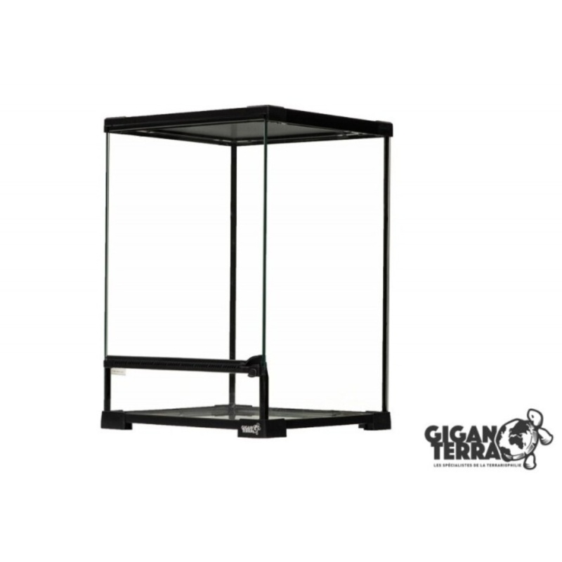 Terraario seisoo neljän jalan varassa, lasipohja ei osu pöytätasolle, pohjan alle helppo laittaa esim lämpömatto.