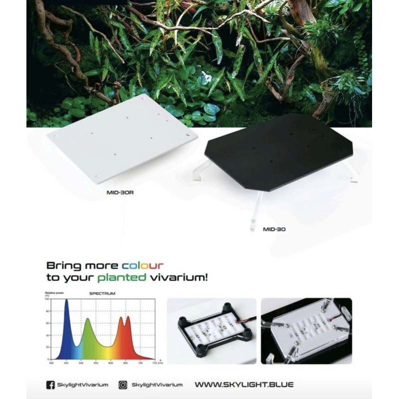 SKYLIGHT valaisimet on suunniteltu hieman eri tavoin kuin yleisimmät terraario/vivaario/paludaariovalaisimet. Yleensä ledvaloilla pyritään korkeaan valon kirkkauteen. MID-30 -sarjassa valon kirkkaus ja valaisimen CRI-arvo on jätetty kolmannen, tärkeän parametrin taakse. Valaisimen tarkoitus on luoda elävä ja intensiivinen värimaailma. Valaisimen tuottaman valon suhteellinen aallonpituuksien voimakkuus on suunniteltu siten että siinä korostuu spektrin eri osissa voimakas teho. Syvän punainen aallonpituus stimuloi kasvien fytokromeja tuottamaan suojaavia pigmenttejä ja spektrin RGB (punainen, vihreä, sininen) -aallonpituudet tekevät kasvien eri värisävyt hyvin näyttäviksi ja voimakkaiksi. Valaisimen näkyvän valon sivuheijasteet on saatettu minimiin jotta katsoja ei häikäisty kasveista heijastavasta voimakkaasta valkoisesta valosta vaan kasvit näyttävät intensiivisiltä mutta pehmeiltä valaistuksellisesti.